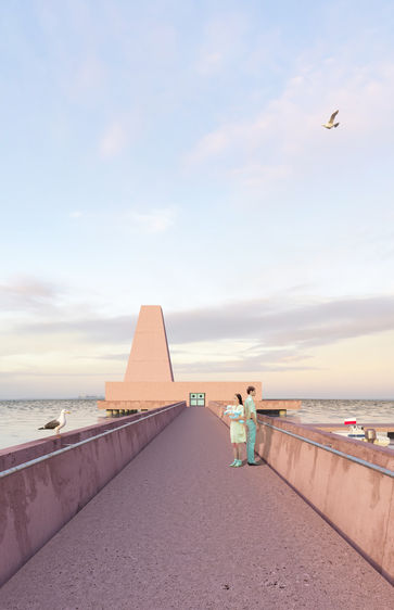 Inspired by the surrounding environment, the new building blends seamlessly with its surroundings. The colored concrete facades mimic the materials of the neighboring houses, such as brick, soft pink hues, and oxidized copper, creating a collage-like effect. The interconnected volumes of the structure are unified by a playful serrated roof trim. Additionally, a whimsical sea pool, influenced by artist James Turrell, adds enchantment with its interplay of forms, light, and water.